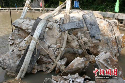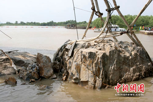 中新網(wǎng)鎮(zhèn)江6月4日電(趙國財(cái) 唐娟)4日下午,首塊《瘞鶴銘》摩崖石刻疑似殘石被巨型“勇士號(hào)”浮吊船吊起約半米后發(fā)生碎裂,首次起吊被迫終止。在打撈人員下水清理碎石后,傳來最新消息!动廁Q銘》打撈項(xiàng)目現(xiàn)場(chǎng)總指揮王雷介紹,碎裂的石頭不會(huì)對(duì)其他三塊預(yù)備打撈的石頭造成損壞。相較于首塊殘石,他更寄希望于壓在該石下面的殘石。他表示,爭取一周后展開第二次打撈。