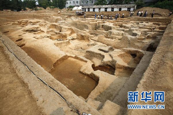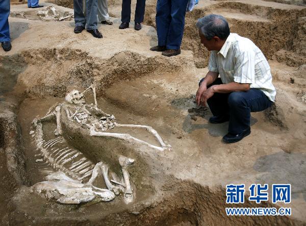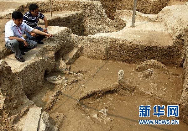 這是6月6日拍攝的洛陽市林校西周洛邑祭祀遺址的人馬組合坑。當(dāng)日,河南洛陽市文物局組織專家對(duì)洛陽市林校西周洛邑祭祀遺址考古發(fā)現(xiàn)進(jìn)行研討并向媒體發(fā)布了發(fā)掘成果。這處遺址西距瀍河約1公里,西北距北窯西周墓地及西周鑄銅遺址約4公里,總發(fā)掘面積為945平方米,于2009年2月開始發(fā)掘。考古人員在洛陽市林校工地共發(fā)現(xiàn)西周灰坑59座、流水溝1條、墓葬14座以及唐代灰坑42座,其中31座西周祭祀坑的發(fā)現(xiàn)是本次發(fā)掘的重要收獲,為尋找西周洛邑城址提供了又一重要線索。新華社發(fā)(張曉理 攝)
