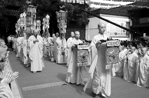 7:50,迎請(qǐng)法會(huì)結(jié)束,棲霞寺住持隆相法師跪拜之后,小心翼翼地捧起了錦盒,向朝天宮的東門(mén)走去,傳義和曙光兩名法師隨行兩側(cè)護(hù)衛(wèi)。