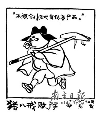 “文革”結(jié)束后,華君武出任全國美協(xié)副主席。這個時期華君武特別喜歡畫豬八戒。他認(rèn)為人性中的弱點(diǎn),豬八戒幾乎大都具備。上世紀(jì)80年代假冒偽劣產(chǎn)品出現(xiàn),他揮筆創(chuàng)作《豬八戒敗陣》,畫中的八戒之所以敗陣,就因沒想到連他用的釘耙也是假冒偽劣產(chǎn)品,因而打了敗仗。因?yàn)檫@一系列諷刺作品,有人形容華君武的漫畫是“刀刀見血,入木三分”。