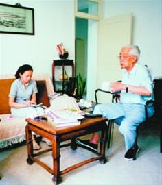 9時(shí)整,我輕輕叩開了華老的房門,開門的是華老的兒子。走進(jìn)客廳,上穿靠色汗衫、下著同色系便褲,鬢發(fā)雪白、氣色卻不錯(cuò)的華老正等候我們的到來(lái),熱情地給我們讓了座。