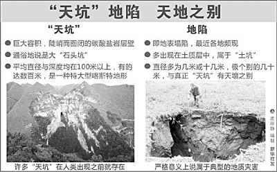 專家指出:“天坑”頻現(xiàn),這樣的用語足以駭人。然而根據(jù)地質(zhì)學定義,真正的“天坑”是指具有巨大容積,陡峭而圈閉的碳酸鹽巖層壁,通俗地說這是一種大“石頭坑”,其平均直徑與深度均在100米以上,有的達到數(shù)百米。它是一種特大型喀斯特地形。許多 “天坑”在人類出現(xiàn)之前就早已存在。