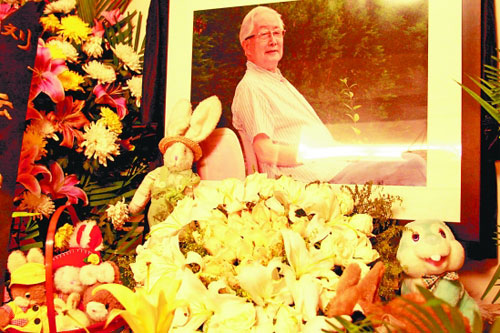 擺放在靈堂上的相片是華老的小兒子華方方在2005年春末拍攝的,就在自家樓下小花壇,一小枝綠色枝條,老人安詳?shù)男δ槪瑲忭嵣鷦?dòng),華老生前看過(guò)非常滿意。華老屬兔,他和兔子感情特別深,晚年更成了老小孩,睡床四周是大大小小的卡通兔、絨毛兔,他當(dāng)兔子王,F(xiàn)在這些兔子朋友環(huán)繞著他的遺像,華老一點(diǎn)都不寂寞,有兩只他最心愛的玩具兔還將陪他在墓地到老。