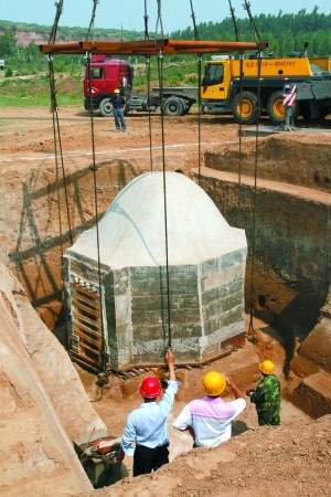 為了確保該墓成功整體搬遷,考古人員用石膏等材料在墓穴外圍做了一層防護(hù),在墓穴東北角處搭置有一個平臺,平臺上放置了4根鐵軌作為底座,墓穴整體吊出地面后被放置其上。深坑中的墓室下方被整體架起,墓室成為一個可以移動的整體,然后由吊車進(jìn)行搬遷。