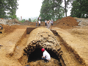 古墓的墓室總長約8.5米,寬約4.1米。古墓的券頂砌筑則十分講究,為三券三幅式六層,也就是一層豎排磚下疊壓一層橫排磚,共交疊成三券三幅。這類形制的待遇,只有明代功臣和王侯才能夠享用。記者從已經(jīng)破口的古墓后壁的洞口向里眺望,隱約能夠看見墓室是分為前后兩部分,就是分前后墓室。記者看見中間分隔墓室的門道為青石材質(zhì),分為左右開啟,高約近2米,寬達(dá)1米左右,顯得十分厚重。據(jù)了解,23日上午出土了一對(duì)墓志,被運(yùn)回博物館。目前,墓室里究竟埋藏著什么寶物,還有待進(jìn)一步發(fā)掘。