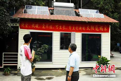 記者看到,這間鋼架結(jié)構(gòu)的房屋功能齊備,雖只有10余平米,但衛(wèi)生間、沐浴間、客廳、臥室一應(yīng)俱全。該房子的主人、退休工程師朱培世告訴記者,房子是由他和團(tuán)隊(duì)成員花了10個(gè)月左右的時(shí)間完成,屋頂上裝有4大塊太陽(yáng)能板,屋內(nèi)的熱水、通風(fēng)、照明、供暖、甚至降溫都由這幾塊太陽(yáng)能板提供的能量完成,是一座名副其實(shí)的太能房屋。其方倉(cāng)建筑、儲(chǔ)冷降溫、太陽(yáng)供暖、多功能窗、電池支架還獲得國(guó)家專利。