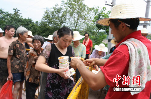 在肖溪鎮(zhèn)民國新街,盒飯供應(yīng)處也喂?jié)M了人,菜飯飄香!拔覀冞@個(gè)安置點(diǎn)的災(zāi)民共有200多人,全部住在老百姓家里,吃飯由政府統(tǒng)一解決。還設(shè)立了開水集中供應(yīng)點(diǎn),方便群眾解渴!
