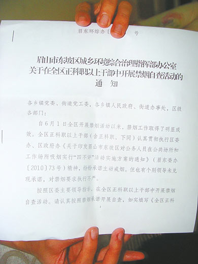 昨日上午,(四川)眉山市東坡區(qū)禁煙行動(dòng)辦公室(簡(jiǎn)稱(chēng)“治理辦”)工作人員正在起草一份關(guān)于禁煙的文件。文件的題目是《眉山市東坡區(qū)城鄉(xiāng)環(huán)境綜合治理指揮部辦公室關(guān)于在全區(qū)正科職以上干部中開(kāi)展禁煙自查活動(dòng)的通知》,包括幾百字的文字和一份禁煙自查表。