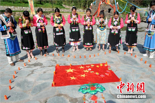 一大早,寨子里的羌族同胞來(lái)到廣場(chǎng)上,默默地布置祭祀現(xiàn)場(chǎng)。幾十根蠟燭圍成一個(gè)大大的“心”字圖案,一面鮮艷五星紅旗放在“心”字圖案當(dāng)中,國(guó)旗上,擺放著一個(gè)個(gè)精致的香包。當(dāng)一根根蠟燭被依次點(diǎn)燃,羌族姑娘雙手合十,低頭為逝者致哀、為生者祈福。