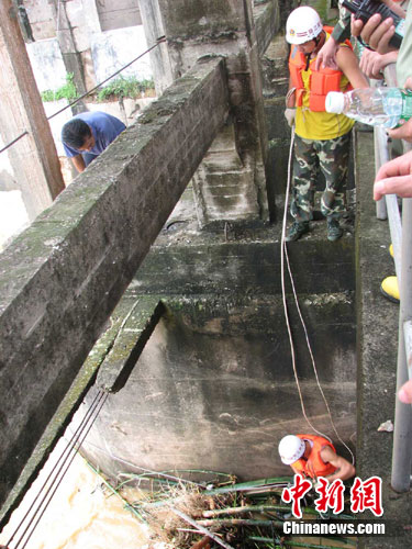 大壩閘門下,水深近6米,水流異常湍急,洪水也異常冰冷,且堆滿了垃圾,雖然消防官兵做好了安全保護(hù),并關(guān)好閘門,下游也安排了漁船隨時(shí)準(zhǔn)備救人,但是水下的情況不明,一不小心就有被洪水沖走或被水下雜物扎傷的危險(xiǎn)。在其中靠近岸邊的一個(gè)孔閘門,大樹與竹子卡在閘門的中間,閘門無(wú)法放下,消防官兵只能在異常湍急的水流中作業(yè),由于缺少著力點(diǎn),水下的消防官兵多次沒入水中,險(xiǎn)象環(huán)生,經(jīng)過近20多分鐘的作業(yè)才將雜物捆住。