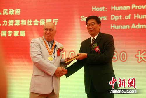 中新網(wǎng)長沙9月30日電(劉柱 華城)30日,湖南省第五屆“瀟湘友誼獎”頒獎儀式暨外國專家國慶招待會在長沙舉行,來自世界13個國家的20位專家榮獲“瀟湘友誼獎”。湖南省省長徐守盛致辭并親自為獲獎專家頒獎。