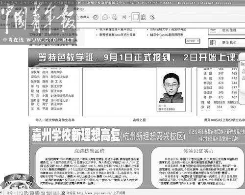 據了解,“沖刺中國名校精英班”是新理想高復在2005年開設的。舉報人說,這個班每年都會招收大量杭高、杭二中、學軍等杭州重點中學的學生,免費培訓幾次、十幾次課,每次培訓時間在兩個小時左右,然后會讓學生填好一張表格,這些培訓學生就這樣成了新理想高復的精英班學生。“高考后,考上清華、北大的獎勵8000元,考入復旦、人大的獎勵5000元。”