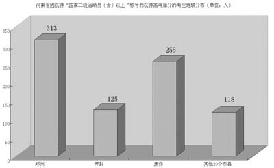 統(tǒng)計(jì)還發(fā)現(xiàn),田徑、籃球、足球三項(xiàng)加分考生在各地市分布比較平均,而健美操、無線電測(cè)向和定向越野卻集中在成都、綿陽和南充3市,共為500人,占這三項(xiàng)加分總?cè)藬?shù)的78%。