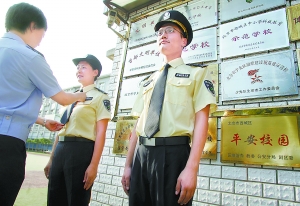 昨天(25日),北京市首批校園安全護(hù)衛(wèi)大隊(duì)的175名隊(duì)員被分配到了原西城區(qū)49所學(xué)校的58個(gè)校址。開(kāi)學(xué)后,這些身著黃色標(biāo)準(zhǔn)制服,經(jīng)過(guò)半個(gè)月魔鬼訓(xùn)練,學(xué)習(xí)了格斗和急救技能的護(hù)衛(wèi)隊(duì)員將擔(dān)負(fù)起護(hù)衛(wèi)校園安全的重任。