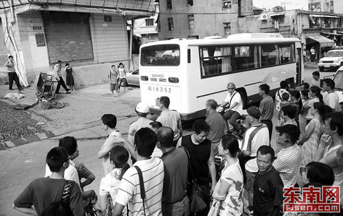 住在路邊四樓的周小姐目睹了車(chē)禍發(fā)生的經(jīng)過(guò)。她告訴記者:“當(dāng)時(shí)我正站在陽(yáng)臺(tái)邊梳頭,大約7:50的時(shí)候,一輛大客車(chē)從西邊開(kāi)過(guò)來(lái),車(chē)速不是很快。開(kāi)到我樓下時(shí),我看到車(chē)撞到了一個(gè)小女孩和一個(gè)老人,然后車(chē)子又繼續(xù)往下開(kāi),緊接著撞到一前一后兩名婦女,又撞到一名騎著三輪車(chē)的男子,最后左轉(zhuǎn)彎停下了。”
