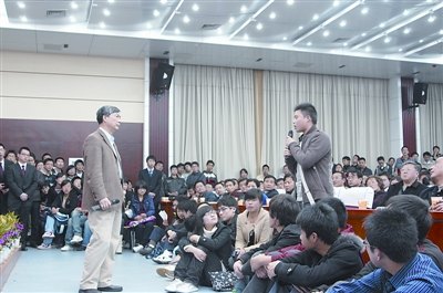 面對學(xué)生提問,李培根表示,學(xué)校處于高速發(fā)展期,引進的許多重大科研項目都需要錢;人文氛圍的營造不容小視,但硬件暫時落后,“要克服一下”!霸蹅儗W(xué)校的行政樓,在中國很難找到比它更差的!彼p輕說,同學(xué)們報以掌聲。2個多小時的見面會,李培根站著回答問題。 (記者 李佳)