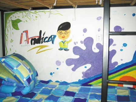 看看這面童趣橫生的手繪墻,它可不是在幼兒園里,也不是在小女孩家里,而是在浙江大學(xué)紫金港校區(qū)一個(gè)大二男生的寢室里!