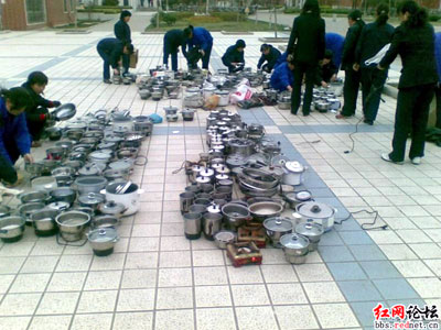 曉云指出,用熱得快燒熱水要比在天寒地凍的天氣里頂著寒風(fēng)去水房排好長(zhǎng)的隊(duì)打水方便的多:“另外學(xué)校的食堂也長(zhǎng)期處于校內(nèi)壟斷狀態(tài),飯菜越來(lái)越難吃,份量越來(lái)越少,而價(jià)錢(qián)卻越來(lái)越高,所以我們干脆自己用電飯鍋、電磁爐開(kāi)伙了,改善下生活!