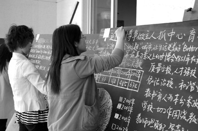 晚報(bào)訊 為提高教師教學(xué)基本功,上海第二工業(yè)大學(xué)日前舉行以“迎世博爭(zhēng)做主人、抓中心育人為本”為主題的教職工板書競(jìng)賽,首次邀請(qǐng)學(xué)生做評(píng)委給老師打分。由各學(xué)院選拔出的35名教師分老、中、青三個(gè)年齡組進(jìn)行比賽,評(píng)分標(biāo)準(zhǔn)由版面構(gòu)思合理、用規(guī)范字、筆畫清楚有力等方面組成。比賽裁判組邀請(qǐng)了各學(xué)院教學(xué)院長(zhǎng)等18 人進(jìn)行現(xiàn)場(chǎng)評(píng)分,同時(shí)首次邀請(qǐng)30位學(xué)生學(xué)習(xí)委員代表一起參與評(píng)分。比賽現(xiàn)場(chǎng)吸引了數(shù)百名教職工前來(lái)觀摩、取長(zhǎng)補(bǔ)短! 跤浾 肖波 攝影 蔣世偉