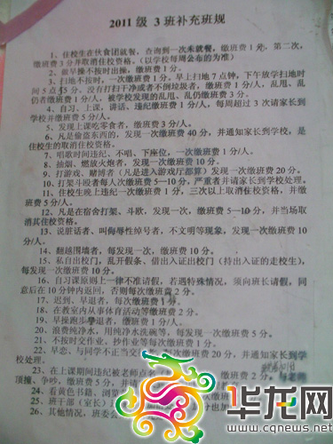如此多的學(xué)生被扣分、罰款,其依據(jù)是什么?在班上同學(xué)的指引下,記者在該班教室進(jìn)門(mén)靠左的墻上看到兩張《2011級(jí)3班補(bǔ)充班規(guī)》,班上同學(xué)告訴記者:該班規(guī)就是扣分、繳罰款的依據(jù)。