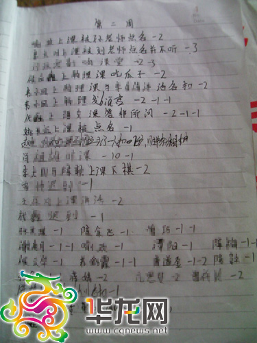 記者翻開(kāi)其中一頁(yè),看到的便是第2周班上同學(xué)的扣分情況,該情況詳細(xì)記錄了哪位同學(xué)因何事,而被扣了多少分。