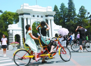 暑假來清華、北大等首都著名高校旅游的各地游客持續(xù)增加,許多是由學(xué)生與家長(zhǎng)組成的暑期名校游團(tuán)隊(duì)。清華大學(xué)每天接待游客一兩萬人,雙休日多達(dá)幾萬人。校方為游客增設(shè)了旅游觀光車、義務(wù)講解處及24小時(shí)自行車租賃等業(yè)務(wù),提供便利的人性化服務(wù)。 本報(bào)特約攝影 李文明 RJ136