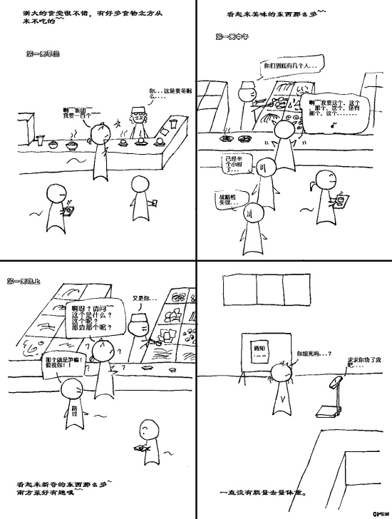 “很有生活氣息啊。樓主MM這一個月活得比我們4年還精彩啊!本W(wǎng)友直言,貼近生活的漫畫看起來輕松愉快,細(xì)細(xì)瀏覽,還會想起自己曾經(jīng)的菜鳥生活,“剛來紫金港的時候,我也幾乎天天迷路”,“想起自己剛進大學(xué)的時候,也是對什么都好奇啊!