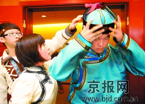蘇·尼特,來(lái)自呼和浩特市二中高二年級(jí)。今天他代表蒙古族青少年來(lái)到了同心營(yíng)。一身盛裝的他顯得特別精神,寶藍(lán)色的長(zhǎng)袍和寶藍(lán)色的帽子,蘇·尼特說(shuō),這是蒙古族的盛裝,特意穿來(lái)為祖國(guó)母親過(guò)生日,“心情激動(dòng)得沒(méi)法說(shuō),一夜都睡不著”。海南黎族的林衡帶來(lái)了黎族特色的編織袋,上面的花紋很有黎族特色,“我們黎族是一個(gè)熱情好客的民族,這一次和各民族兄弟姐妹齊聚在一起為祖國(guó)母親過(guò)生日,我們都要拿出最大的熱情!
