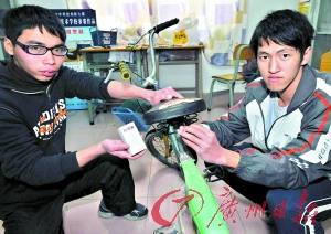 本報訊 (記者李立志 通訊員南宣)10來元錢的門鈴還有什么其他用途?南沙黃閣成人學(xué)校梁俊斌和張啟華手里拿著一個自行車的頭籃,一個自行車的座包,一個常見的家用門鈴,這就是“自行車防盜報警器”。他們經(jīng)過三個多月的時間研制,發(fā)明了這個東西。在第25屆廣州市青少年科技創(chuàng)新大賽上,南沙區(qū)黃閣成人文化技術(shù)學(xué)校兩個農(nóng)村的孩子發(fā)明創(chuàng)造作品《自行車防盜報警器》獲得了金獎。