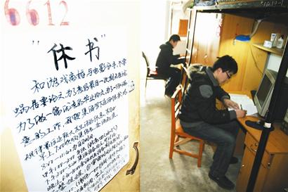 寢室長付寅解釋說,“休”一是指要合理安排休息時間,請同學(xué)們少串門;二是指改掉平時愛看電影、愛玩游戲的“惡習(xí)”。“海報很張揚,主要是為了吸引同樓同學(xué)的注意。我們的大學(xué)生活時間所剩不多,我出這個點子,也是想讓大家監(jiān)督我們的行為”。海報上還寫明了一天的作息時間。為表決心,“休書”最后還有寢室全體成員簽名。