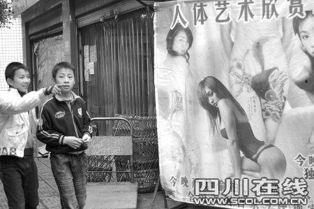 記者在觀察的10多分鐘發(fā)現(xiàn),先后有宜賓縣育才中學(xué)、柏溪小學(xué)的100多名小學(xué)生從這里經(jīng)過,部分學(xué)生圍在宣傳畫前指手畫腳。在電影院附近開店的彭先生不無憂慮地告訴記者:“孩子們肯定會受到影響的!