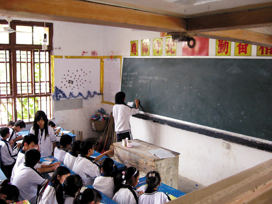 昨天下午3時許,羊城晚報記者來到甲子第一中學(xué)。下午第二節(jié)課的上課鈴恰好敲響,在操場課間休息的學(xué)生們紛紛跑回教室,也有不少學(xué)生磨蹭著不肯進(jìn)去。羊城晚報記者從教學(xué)樓的一樓走至三樓,只見不少教室均看不到老師在授課,學(xué)生們被安排自習(xí),有班干部在黑板上抄寫練習(xí)題!坝袥]有老師給你們上課呀?”有幾個靠門口的同學(xué)搖搖頭,稱他們從早上開始就自習(xí)了。