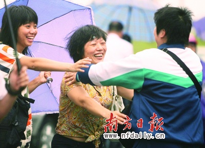 佛山三中高三的鐘老師沒想到自己會成為學生們的“催淚彈”,一名女生從考場出來就撲上去與鐘老師擁抱,一邊大聲地說:“老師我從來沒有覺得你像今天這么漂亮過!你讓我不要想你,但考試出來你總是第一個出現(xiàn)在我面前!”鐘老師被七八名女生團團圍住。起初大家還有說有笑,很快就有一名短發(fā)女生轉(zhuǎn)笑為泣,伏在鐘老師肩頭淚流滿面。其余女生見狀也紛紛紅了眼圈,捂住嘴不想哭出聲來。記者注意到,這些女生每人衣服上也都別著一只笑臉徽章!斑@都是老師送給我們的,希望我們能夠笑對高考。”