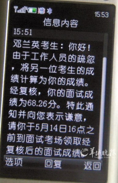 鄧蘭英稱,當天下午約1時30分,她進入考場(注:考前一小時考生封閉抽簽確定考試順序,真正開考是2時30分),她是第二個進入考室的,前后面試了約10分鐘。“面試完后,發(fā)給我的面試通知書上的成績?yōu)?8.17分。我離開考場大約40分鐘后,有人自稱考試工作人員給我來電說:因工作人員疏忽把我的分數搞錯了,叫我速回考場拿第二份成績。大概30分鐘左右,對方又用移動電話發(fā)來短信說:“×××考生,由于工作人員的疏忽,將另一位考生的成績計算為你的成績。經復核,你的面試成績?yōu)?8.26分。請你在5月14日16點之前到面試考場領取經復核后的面試成績!