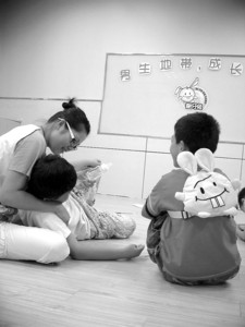 第一課的主題是 “特別的禮物——成長話題”。老師高偉偉說,只有很特別的人才能參加這個特別的夏令營,要求孩子們一起做游戲,驗證自己是不是有資格來談?wù)撨@個特別的話題。第一個游戲是“做一個自己”,每個人得到一個用大海報紙做成的男孩輪廓,需要他們填完整,使這個男孩代表自己。第二個游戲要求孩子們根據(jù)指令行事,模仿對應(yīng)年齡層的表現(xiàn)!皨寢,喝奶! ”一個男孩躺在地板上,學(xué)嬰兒討奶喝,把其他男孩逗得哈哈大笑。 “我們就是從小娃娃開始,成長為現(xiàn)在的男子漢。恭喜你們,有資格討論成長話題是長大的標(biāo)志! ”高老師說。通過這個游戲,孩子們知道,談?wù)摮砷L話題是8歲以上孩子的特權(quán)。