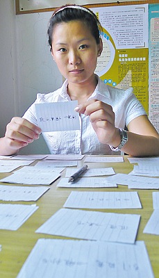 北方人難聽懂南方話,更難學(xué)重慶的地方土話!在萬州區(qū)龍沙鎮(zhèn)龍安村任村委黨支部書記助理的遼寧籍大學(xué)畢業(yè)生李飛就是其中一個,她是去年考上我市的“村官”。在9個月的“村官”生活中,她因不懂當(dāng)?shù)赝猎掫[過笑話,遭過白眼。因此,她不停地觀看帶有重慶方言和土話的電視劇進行模仿,寫了230頁土話“名片”隨身帶,天天念。