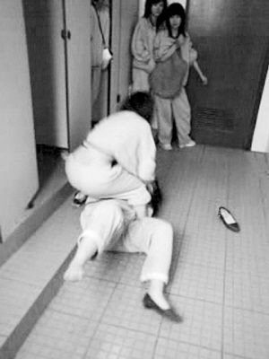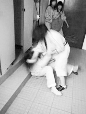 殷瓊是上海西南工程學(xué)校一年級學(xué)生。4月16日下午,她參加考試,題目差不多做完了,同學(xué)小成對她耳語:“下課去校門口,有人找你談話!币蟓倹]答應(yīng),小成幫她交卷,把她拉到校內(nèi)一幢大樓2樓女廁所門前,那里還有幾個女生在等著。拉扯進(jìn)廁所后,另一名同學(xué)劉幸一邊拍她肩膀挑釁,一邊讓其他女生打開手機(jī)攝錄。視頻記錄了殷瓊的噩夢,殷瓊的母親向記者出示了這段影像:
