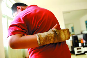 第二次受傷在5月21日。曹力強說,“那節(jié)是社會課,我在課上問了同學(xué)一個問題,教社會課的張老師朝我走過來,我當(dāng)時害怕,就從座位上起身,往教室后面躲,到教室最后面,我拿掃帚擋著身體,張老師抓住我的左胳膊往后別,還掰我手指!