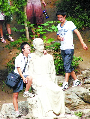 游人坐在“朱自清”腿上照相