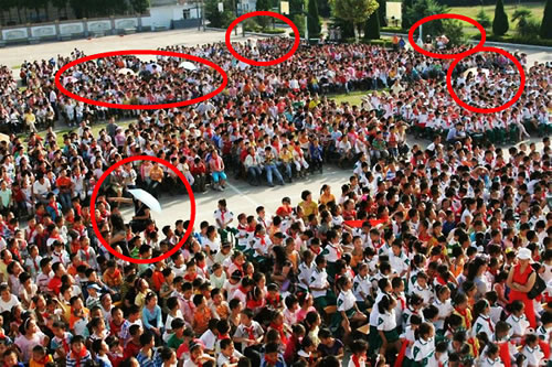 新學(xué)期開學(xué)后的一天下午,時(shí)值“秋老虎天氣”,氣溫達(dá)到三十四度,濱?h實(shí)驗(yàn)小學(xué)兩千余名小學(xué)生服裝整齊地聚集在烈日下的大操場上舉行秋學(xué)期開學(xué)典禮。次日,該縣教育網(wǎng)站發(fā)了題為《濱?h實(shí)驗(yàn)小學(xué)舉行2009年秋季開學(xué)典禮》的報(bào)道,隨文還配發(fā)了三幅圖片,其中有一圖片顯示,密密麻麻的學(xué)生方陣中,約有十位女教師打傘防曬。