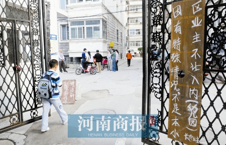 9月15日上午7時許,鄭州市伊河路與桐柏路交叉口附近的長宏花園小區(qū)門口多了個牌子:因有特殊原因,不是本小區(qū)業(yè)主不讓入內(幼兒園)。落款為長宏業(yè)主。同時,小區(qū)業(yè)主也當起“門神”,守著小區(qū)大門,不讓學生進入小區(qū)內長宏幼兒園上課。
