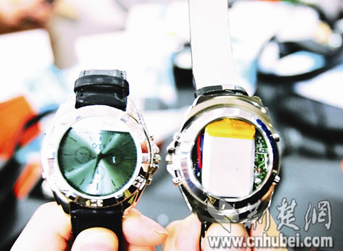 “竅門在這里!惫ど倘藛T把手表后蓋揭開(kāi),里面多了一塊微型電路板和芯片。原來(lái),這是一套短信接收裝置,收到短信后,還可以存儲(chǔ)在手表中。