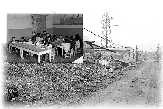 杭州豐潭路邊的方家塘村早就開始拆遷了,現(xiàn)在周圍已經(jīng)沒有居民,可是唯獨(dú)村中的幼兒園卻遲遲沒有搬遷,孩子們?nèi)匀辉趶U墟里上課。廢墟中的幼兒園成了一座孤島。