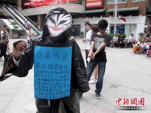 中新網洛陽5月24日電 (記者 師紅壘 通訊員 余啟兵 吳伊曉)身著用舊報紙、塑料袋,分發(fā)環(huán)保小貼士、環(huán)保綠絲帶……日前,洛陽師范學院的53名環(huán)保志愿者來到洛陽市新都匯市場,開展了一場“低碳生活、和諧洛陽”環(huán)保時裝秀表演(如圖),吸引了眾多市民前來駐足觀看。