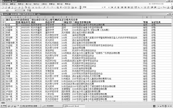 打開這個(gè)公示名單,前兩行的內(nèi)容分別是:“許鑫;性別:男;報(bào)名序號:13103003;地區(qū):杭州市淳安;所在中學(xué):淳安中學(xué);二級證書:射擊;二級證書競賽名稱:2007年浙江省中小學(xué)生射擊錦標(biāo)賽;等級:省級;認(rèn)定結(jié)果:合格”。