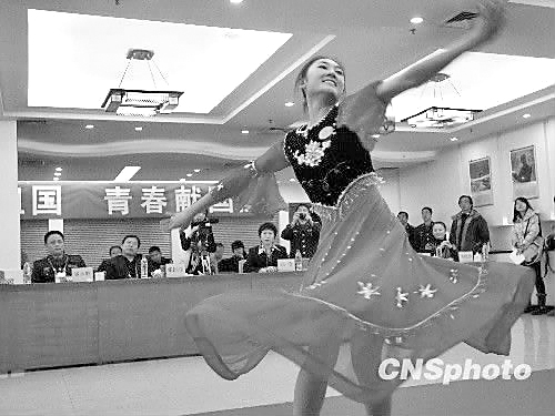 8時10分,面試開始,第一個上場的陳曉琴做了簡單的自我介紹,大屏幕顯示她抽中的問題是:如何能做一個合格的軍人。陳曉琴說,要做一名合格的軍人不但要嚴(yán)明紀(jì)律、聽從指揮,還要團(tuán)結(jié)同志。接著她表演了跆拳道,并拿下了北京市女兵面試的第一個分?jǐn)?shù)——26分,全部考試,陳曉琴用了8分鐘。 8時50分,來自民族大學(xué)舞蹈學(xué)院的5號應(yīng)試者朱瑜上場了。回答了相關(guān)的問題后,她拿出了一把藍(lán)色的綢扇,跳起了一套她自編的舞蹈,婀娜的舞姿征服了全場的觀眾,也征服了9位評委,她得了28.57的高分,這個分?jǐn)?shù)也是海淀考區(qū)全天考試的最高分。與她同樣得了最高分的還有清華大學(xué)的王曉麗。