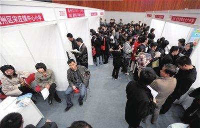 昨天,近幾年來本市首場中小學教師專場招聘會在首師大體育館舉行,1.3萬名北京高校應屆畢業(yè)生蜂擁而至,競爭132家本市中小學提供的1100余個崗位。在招聘現場,市區(qū)學校攤位前人頭攢動,而郊區(qū)學校則門可羅雀,兩極分化嚴重。