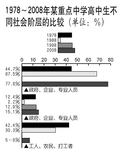 “從調(diào)查結(jié)果看,來自政府管理者、企業(yè)管理者與專業(yè)技術(shù)人員等傳統(tǒng)和新興的優(yōu)勢階層的子女獲得了最多進入重點高中的機會,而社會弱勢階層享受優(yōu)質(zhì)教育資源的機會則逐漸減少,尤以工人、農(nóng)民的子女下降最為顯著,”王雄說,“大學生的社會階層背景,與高中生的社會階層背景是基本同構(gòu)的,高等教育入學機會狀況是高中教育的直接延續(xù)!