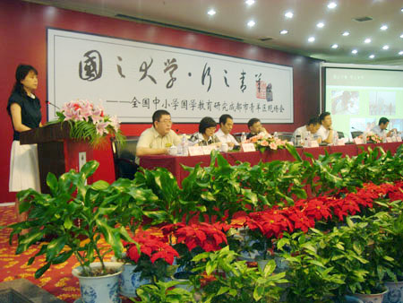 7月8日,全國中小學國學教育研究成都市青羊區(qū)現(xiàn)場會在蓉召開,來自北京、青島、重慶等地的上百名專家代表就國學教育在中小學校園內(nèi)的開展進行了交流討論。據(jù)中國教育部語言文字應用管理司司長王登峰透露,有關部門準備邀請歌星演唱經(jīng)典詩詞,以契合中小學生的年齡特點和心理需求。