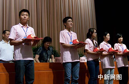 在2008年服務(wù)西部的志愿者代表發(fā)言后,全場志愿者進(jìn)行了宣誓。隨后,雷于藍(lán)為即將開赴廣西、四川汶川、甘肅隴南和貴州四省區(qū)的四支服務(wù)隊(duì)授旗。